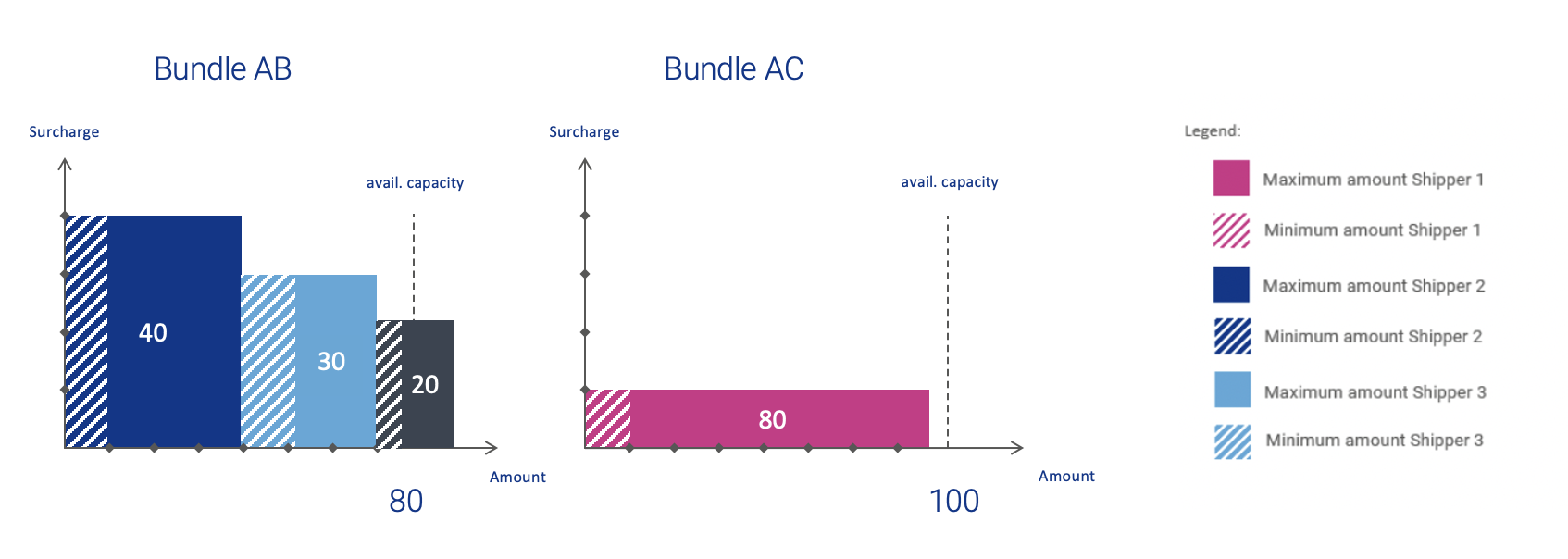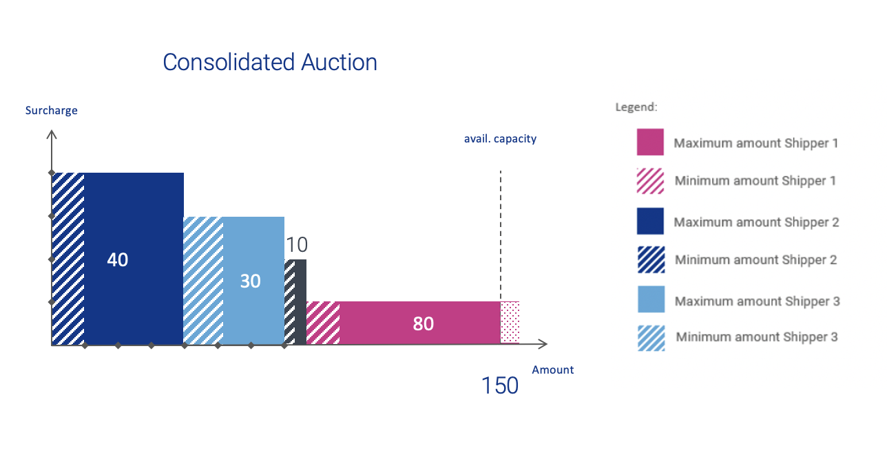 Now, there was an underdemand in auction AC, but an overdemand in the consolidation and ranking of bids. In the consolidated evaluation of bids, the lowest surcharge offered by any shipper that received capacity was 1 (Shipper Pink). Since that price is higher than the surcharge established by the individual auction AC (in this case 0), that will be the clearing price paid by the shippers that participated in that auction (Shipper Pink).